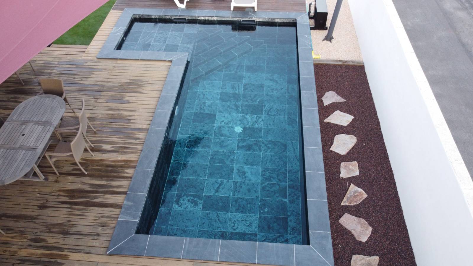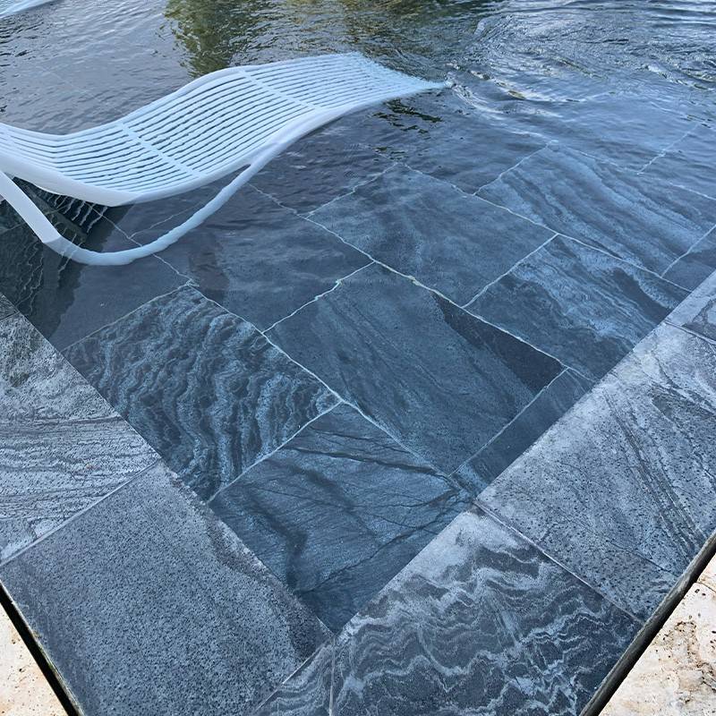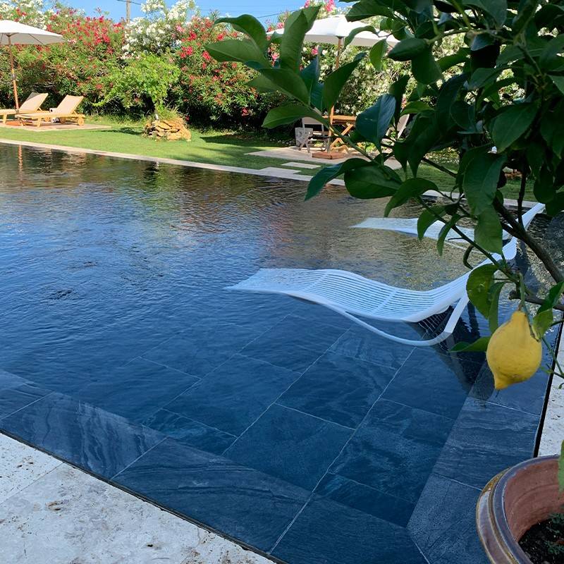 L'entretien est également un atout : un simple nettoyage régulier à l’eau suffit pour maintenir son éclat naturel. Pas besoin de produits spécifiques, ce qui en fait un matériau aussi pratique qu’écologique. Son usage est même compatible avec les intérieurs de piscine, garantissant une continuité esthétique entre votre bassin et ses abords.